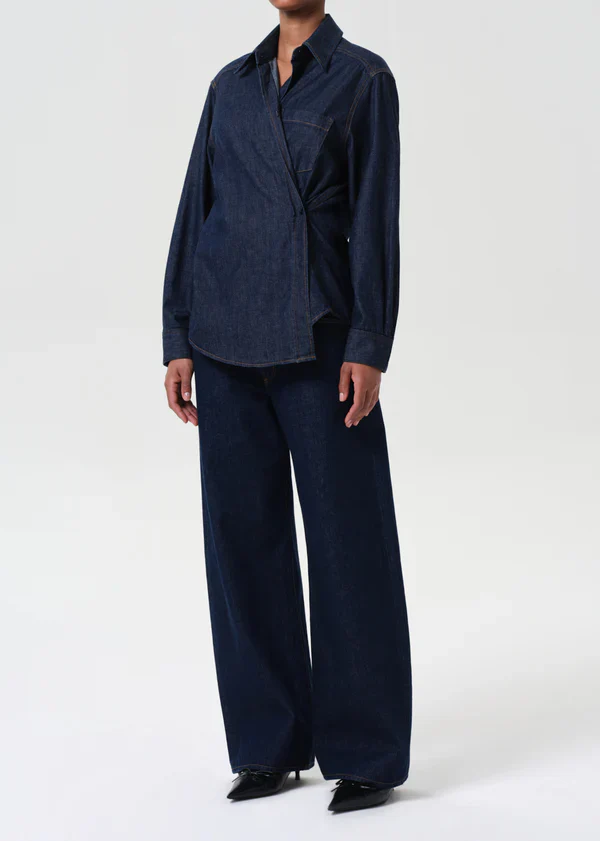 The Kaelin Shirt is cut from clean rinsed indigo denim and designed with a subtle wrap-front effect that can be worn multiple ways. Lightweight yet structured, the button closure allows for styling versatility—wear it open and oversized or crossed and tucked.