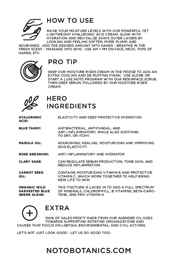 Keep our Moisture Riser Cream in the fridge to add an extra cooling and de-puffing finish. Use alone or start a luxe NOTOprogram with our Resurface Scrub, then Deep Serum, followed by our Moisture Riser Cream.